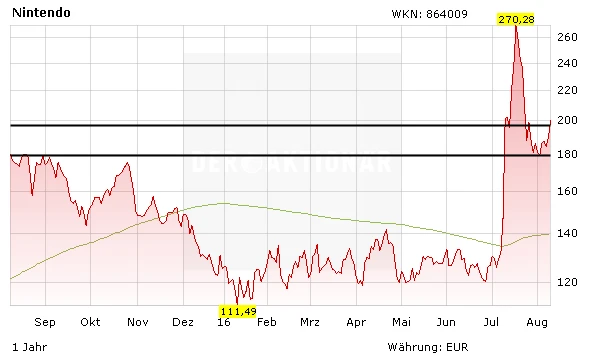 Nachdem sich die Nintendo-Aktie in den letzten beiden Wochen im Anschluss an die rasanten Kursverlusten stabilisiert hatte, geht es heute fünf Prozent aufwärts. Damit erreicht die Aktie wieder das Kursniveau aus 2011 und generiert ein Kaufsignal. Ein Minibetrag kann jetzt investiert werden. Aufgrund der hohen Volatilität eignet sie sich derzeit aber nur für Zocker.