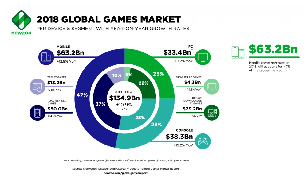 Klar ist: Es geht um einen gewaltigen Markt. 2018 betrug der Gesamtumsatz der mobilen Spiele rund 63,2 Milliarden Dollar. Damit macht dieses Segment schon rund 47 Prozent des gesamten Gaming-Marktes aus.