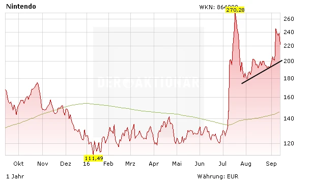 Die Neuigkeiten zur Super-Mario-App haben die Nintendo Aktie in der vorangegangenen Woche ordentlich in die Höhe getrieben. Die Korrektur setzte aber prompt ein, sodass die Aktie bei einem derzeitigen Stand von 225 Euro bislang gut die Hälfte der Gewinne wieder verlor. Die kräftigen Korrekturen, die zum Beispiel auch zu Beginn des Hypes Ende Juli stattfanden, sollten Neueinsteiger auch in Bezug auf die anstehenden Details zur NX im Blick haben. Bereits investierte Anleger lassen ihre Gewinne mit nachgezogenem Stopp laufen.
