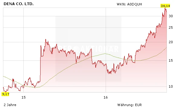 DeNA ist im Vergleich zum Kultunternehmen Nintendo zwar deutlich kleiner, die Aktie ist deshalb aber nicht weniger kaufenswert. Beide Aktien haben ihren Kurs in den letzten vier Monaten verdoppelt. Mit einem 2017er-KGV von 18 ist die Aktie von DeNA allerdings günstiger bewertet als die Nintendo-Aktie (KGV: 33). Außerdem sieht das Chartbild einen Tick besser aus. Während bei Nintendo auf rasante Kursanstiege kräftige Rücksetzer folgen, ist die Aktie von DeNA weniger volatil. Außerdem wurde sie diesen Monat durch Super-Mario-Run auf ein neues Rekordhoch katapultiert.
