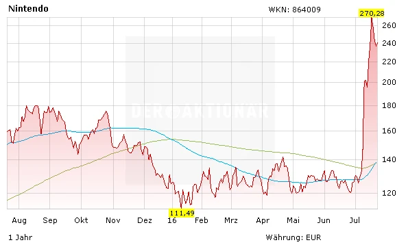 Nachdem Nintendo am Mittwoch ordentliche Verluste (-13 Prozent) einstecken musste, geht es heute wieder bergauf für die Aktie. Sie bleibt trotzdem ein gutes Stück vom Hoch entfernt. Man sollte aber nicht vergessen, dass sie immer noch mehr als 80 Prozent teurer ist als zu Beginn des Monats. Ob sie trotz der hohen Kurse einen Einstieg wagen sollten, lesen Sie in unserer aktuellen Ausgabe.
