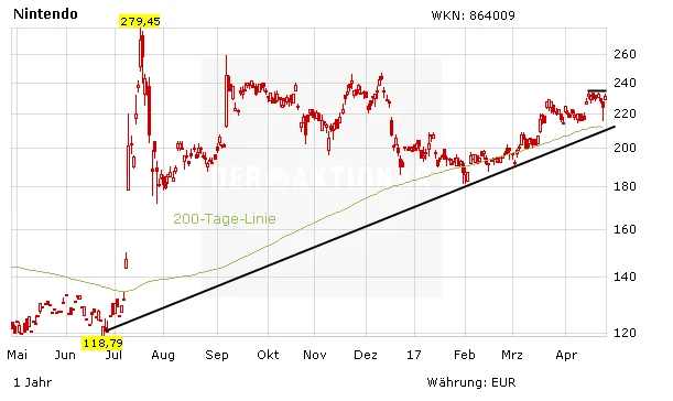 Dank der starken Nachrichten rund um Switch konnte die Nintendo-Aktie Boden gut machen und sich weiter von der wichtigen 200-Tage-Linie nach oben absetzen. Investierte Anleger bleiben an Bord.