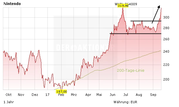 Aufgrund der positiven Nachrichtenlage kehrt die Euphorie bei der Nintendo-Aktie zurück. Mit dem heutigen Kurssprung von rund sieben Prozent erreichen die Titel ein Neun-Jahreshoch. Investierte Anleger lassen die Gewinne bei der ambitioniert bewerteten Aktie (KGV von 50 für 2018) weiter laufen.