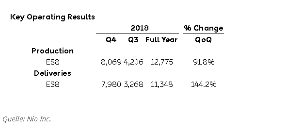 Der Ausblick für das erste Quartal riss die Anleger nicht unbedingt vom Hocker. Für das erste Quartal des Geschäftsjahres 2019 rechnet NIO Inc. mit Auslieferungen beim ES8 von 3.500 bis 3.800 Fahrzeugen. Das würde einem Rückgang von 52,4 bis 56,1 Prozent zum vierten Quartal 2018 bedeuten. Kein Wunder, dass die Aktie den Rückwärtsgang einlegte.
