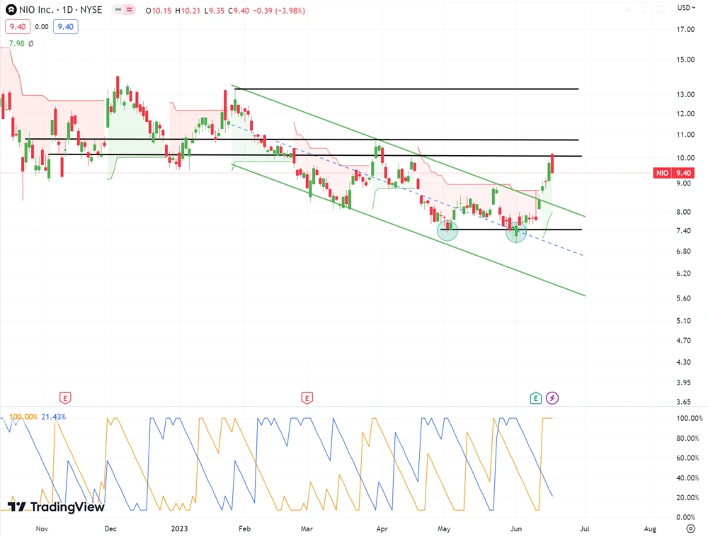 Charttechnisch versucht sich der chinesische Autobauer derzeit am April-Hoch bei 10,03 Dollar. Vor einer Woche ist es der Aktie gelungen, die Oberseite eines seit Januar gültigen Abwärtstrendkanals hinter sich zu lassen, nachdem sie am Support bei 7,40 Dollar ein Doppel-Tief ausgebildet hatte. Mit den Kaufsignalen, welche der Aroon- und der Supertrend-Indikator ausgelöst haben, ist es durchaus wahrscheinlich, dass Nio den Ausbruch über die Horizontale schafft. Gelingt dies, dürften die Bullen das März-Hoch bei 10,74 Dollar ins Visier nehmen. Die nächste Hürde befindet sich anschließend am Januar-Hoch bei 13,23 Dollar.
