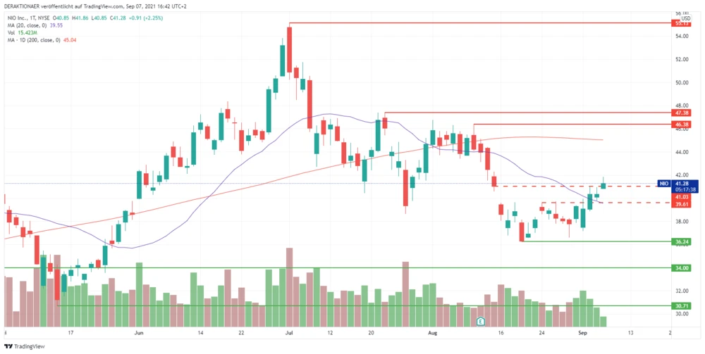 Mitte August fiel die Aktie von Nio noch auf ein Mehrwochentief bei 36,24 Dollar. Von diesem Level aus wurde rückblickend die Erholung eingeleitet. Zusätzlichen Auftrieb lieferten die Rekordverkäufe im August. Der E-Autobauer lieferte im Jahresverlauf bisher 55.767 Fahrzeuge aus. Das ist eine Steigerung von 157 Prozent zum Vorjahreszeitraum.