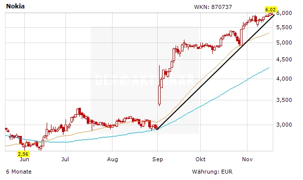 Im Laufe des Tages wird sich entscheiden, ob die Nokia-Aktionäre dem Verkauf der Mobilfunksparte an Microsoft zustimmen. Der Kaufpreis: 5,4 Milliarden Euro. Die Aktie pendelt derzeit um die 6-Euro-Marke.