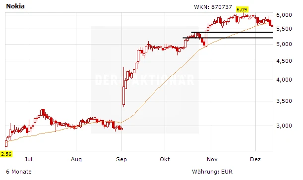 Im nächsten Jahr könnte wieder Schwung in die Nokia-Aktie kommen. Dann nämlich, wenn Nokia eine Sonderdividende zahlen oder einen Aktienrückkauf starten sollte. Darauf spekuliert offenkundig auch Dan Loeb, der mit seinem Hedgefonds Third Point bei Nokia eingestiegen ist. Das Kursziel lautet 8,00 Euro, der Stopp sollte bei 4,80 Euro platziert werden.