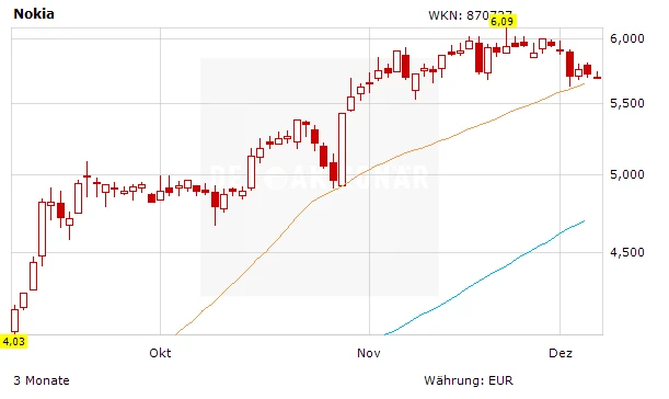 Nach Abschluss der Transaktion wird Nokias Netto-Cash-Position auf rund acht Milliarden Euro anschwellen. Gut möglich ist, dass Nokia eine Sonderdividende zahlt oder einen Aktienrückkauf startet. Darauf spekuliert offenkundig auch Dan Loeb, der mit seinem Hedgefonds Third Point bei Nokia eingestiegen ist. Das Kursziel lautet 8,00 Euro, der Stopp sollte bei 4,80 Euro platziert werden.