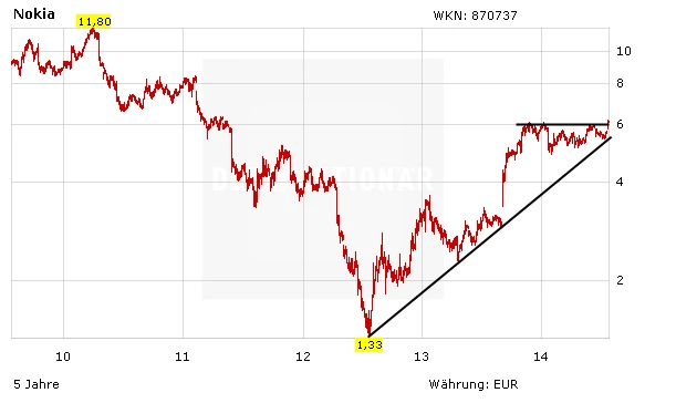 Die Aktie von Nokia hat in der vergangenen Woche einen mächtigen Kurssprung hingelegt und dabei auch den wichtigen Widerstand im Bereich von sechs Euro überwinden können. Grund war das starke Ergebnis im zweiten Quartal. Mehrfach war das Papier in den zurückliegenden Monaten bereits daran gescheitert. Durch den Sprung über diese Hürde wurde ein klares charttechnisches Kaufsignal generiert.