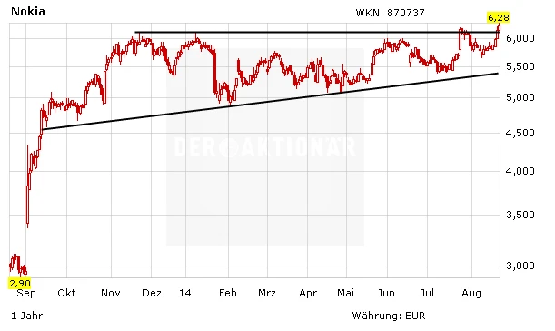 Ein Aufstieg in den EuroStoxx 50 wäre positiv für die Nokia-Aktie zu werten. Auch operativ befindet sich der Konzern ohne das verlustreiche Handy-Geschäft wieder auf Kurs. Investierte Anleger lassen die Gewinne laufen. Das mittelfristige Kursziel liegt bei 8,00 Euro.