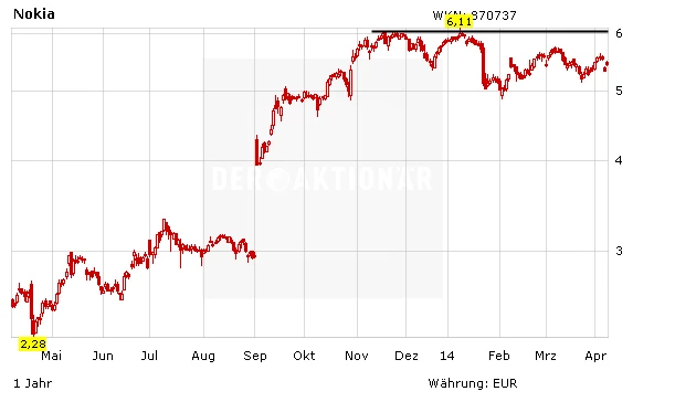 Bereits im September des letzten Jahres hat wurde der Verkauf der Handysparte von Nokia an Microsoft beschlossen. Insgesamt zahlt der US-Konzern 3,79 Milliarden Euro für die Gerätesparte und 1,65 Milliarden Euro für Patentlizenzen auf zehn Jahre. Die Nokia-Aktie legte am Dienstag nach der Freigabe der Kartellbehörden zuletzt um knapp drei Prozent zu. Aus charttechnischer Sicht befindet sich die Aktie aktuell in einer Seitwärtsbewegung. Investierte Anleger bleiben dabei. Ein Neueinstieg drängt sich derzeit nicht auf. Erst über der 6-Euro-Marke könnte neuer ein Aufwärtsimpuls starten.
