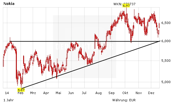 Im Laufe der Woche hat die Nokia-Aktie erneut die massive Unterstützung bei rund 6,00 Euro getestet. An der Marke gelang jedoch der Turnaround. Mit dem Schwung der Fusionsgerüchte kann nun ein neuer Angriff auf das Jahreshoch eingeleitet werden. Für die Zukunft sind die Finnen seit dem Verkauf der Handysparte wieder auf Kurs. Investierte Anleger setzen auf weitere Erfolge beim Konzernumbau und bleiben dabei.
