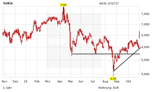 In den vergangenen Wochen hat sich das Chartbild bei Nokia deutlich aufgehellt. Die Entwicklung im Netzwerkgeschäft macht auch für die Zukunft Mut. Nach dem deutlichen Kurssprung am Donnerstag sollten Anleger mit einem Neueinstieg aber vorerst eine Beruhigung abwarten. Investierte Anleger ziehen den Stoppkurs auf 5,50 Euro nach.