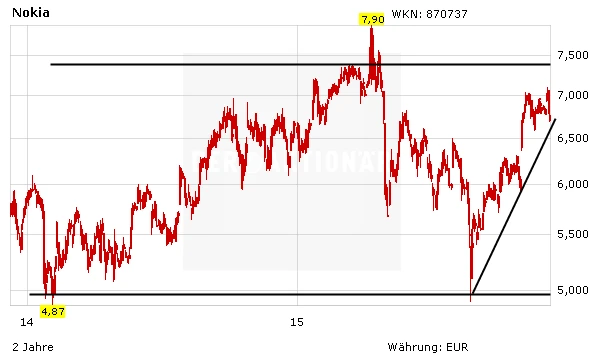 Am Dienstag haben die Aktionäre von Nokia die Übernahme von Alcatel-Lucent gebilligt. Die beiden Unternehmen erhoffen sich dadurch Einsparungen in Höhe von 900 Millionen Euro. Die Analysten sehen in dem Zusammenschluss sogar Potenzial für noch mehr Synergien. Der Aufwärtstrend der Aktie sollte sich deshalb fortsetzen. Anleger können auf einen Sprung über die obere Begrenzung des Seitwärtstrends bei 7,50 Euro spekulieren. Dann wären Anschlussgewinne möglich.