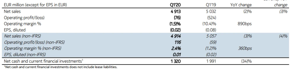 Lediglich 200 Millionen Euro weniger Umsatz sind bisher auf die Folgen von Covid-19 zurückzuführen. Im laufenden Quartal rechnet Nokia aber mit größeren Auswirkungen. Der prognostizierte Gewinn je Aktie fürs Gesamtjahr sinkt von 0,25 Euro auf 0,23 Euro, die Umsatzmarge von 9,5 auf 9 Prozent.