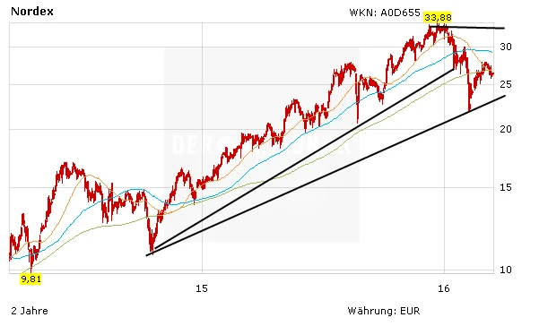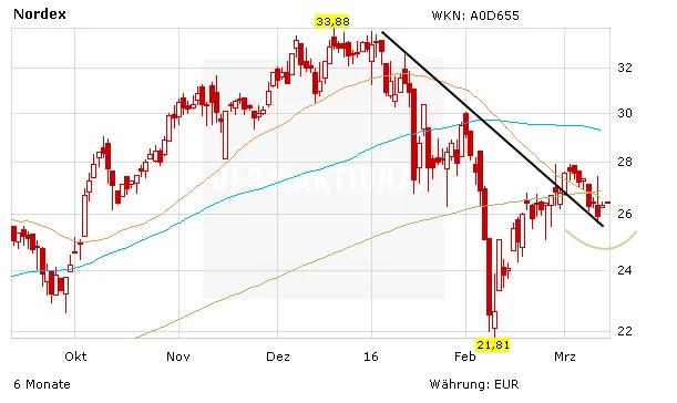 Die 200-Tage-Linie stellt sich für die Nordex-Aktie derzeit als extrem hartnäckiger Widerstand dar. Zwar konnte diese im Anschluss an den knackigen Rücksetzer von 33 bis auf 23 Euro zu Jahresbeginn wieder zurückerobert werden, jedoch kämpft die Aktie noch immer mit dem viel beachteten gleitenden Durchschnitt. Nach einem kurzen Zwischenstopp derzeit zwischen 26 und 27 Euro sollte Nordex allerdings bald wieder nach oben durchstarten und die 200-Tage-Linie hinter sich lassen.