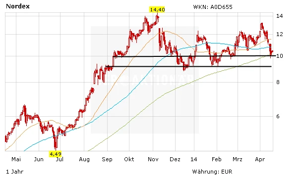 Die aktuelle Börsenphase ist nervenaufreibend. Die Aktie von Nordex springt hin und her, die schöne Aufwärtsbewegung zuletzt wurde auf einen Schlag vernichtet. Im Tief wurde das Papier des Herstellers von Windenergieanlagen sogar bis auf zehn Euro durchgereicht. Damit hat die Aktie genau auf der 200-Tage-Linie angehalten. Auf diesem Niveau konnte sich die Aktie glücklicherweise stabilisieren. Unterstützung bekam das Papier von Warburg Research. Analyst Christopher Rodler rät zum Kauf der Nordex-Aktie. Nach Gesprächen mit dem Hamburger Unternehmen erwartet Rodler einen starken Auftragseingang im ersten und zweiten Quartal. Die Geschäftsentwicklung für 2014 sei nach seiner Einschätzung angesichts des hohen Auftragsbestands gut vorhersagbar. Der Ausblick erscheine Rodler zufolge konservativ. Zudem sollten die regulatorischen Unsicherheiten mit dem novellierten Erneuerbare-Energien-Gesetz (EEG) geringer werden.