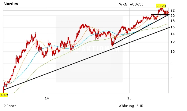 Nach dem guten Start in die neue Handelswoche hat die Nordex-Aktie einen neuen Angriff auf das 52-Wochen-Hoch bei 23,23 Euro gestartet. Ohnehin glänzt das Papier in den letzten Wochen durch Relative Stärke. Die schwache Verfassung des Gesamtmarktes hat die Aktie des Windanlagenbauers gut weggesteckt. Geholfen hat zuletzt sicherlich auch der gute Newsflow. Für seinen Neukunden ARE Elektrik wird Nordex 19 Turbinen der Generation Gamma vom Typ N117/2400 für den Windpark "Kurtkayasi" in der Türkei liefern.