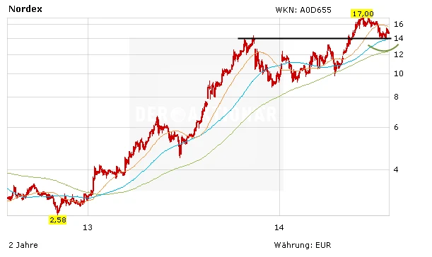 Nordex hat den Turnaround längst geschafft, revidierte zuletzt sogar heimlich, still und leise die Prognose weiter nach oben. Die Aktie hat an der wichtigen Widerstandsmarke von 14,50 Euro wieder nach oben gedreht. Technisch macht das Papier wieder Lust auf mehr. Nächster Stopp ist in der nähe des letzten Hochs bei 17,50 Euro.