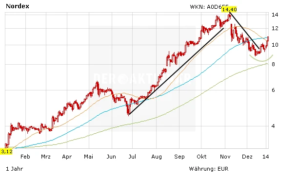 Die Kursentwicklung von Nordex stellte das Nervenkostüm der Aktionäre in den letzten Wochen auf eine harte Probe. Während Branchenkonkurrent Vestas seine Aufwärtsbewegung fortsetzen konnte, schien es als würde das Papier von Nordex nicht vom Fleck kommen. Die Kehrtwende folgte in den letzten Tagen. In einem eher uneinheitlichen Marktumfeld hat das Papier wieder deutlich Boden gut machen und sich über der Marke von zehn Euro festsetzen können.