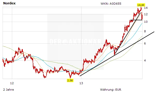 Durch den letzten Rücksetzer ist die Nordex-Aktie aus dem Online-Real-Depot gefallen. Im TSI-Musterdepot bleibt die Nordex-Aktie noch immer fester Bestandteil! Investierte Anleger bleiben weiter an Bord. Das Kursziel bleibt bei 17,50 Euro.