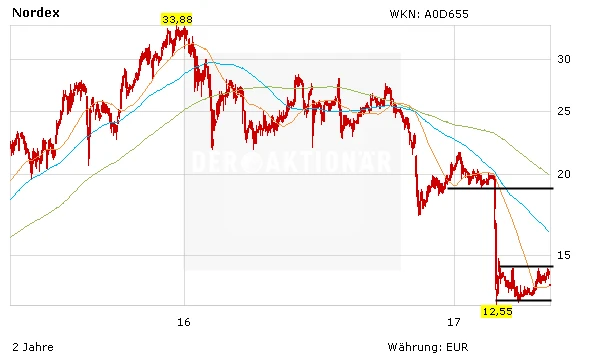 Mit José Luis Blanco weht ein frischer Wind bei Nordex. DER AKTIONÄR vergleicht die Ausgangslage von Nordex mit der von Marktführer Vestas vor rund vier Jahren. Damals hatte Anders Runevad den erfolglosen Ditlev Engel als Vorstand abgelöst. Unter Runevad wurde Vestas auf Profit getrimmt. Die Margen stiegen, die Aktie verteuerte sich seitdem um 330 Prozent. Gelingt es dem neuen Vorstand José Luis Blanco mit seinem Team Nordex wieder auf Kurs zu bekommen, könnten für die nächsten Jahre wieder weitaus bessere Zahlen drin sein. Die Börse gewährt Nordex eine Marktkapitalisierung von 1,37 Milliarden Euro. Bei einem prognostizierten Umsatz von rund 3,2 Milliarden Euro für 2017 ergibt sich ein KUV von nur 0,4. Zum Vergleich: Marktführer Vestas kommt auf 1,7.