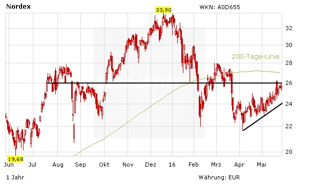 Positive Aussagen des Konkurrenten Vestas haben am Freitag auch die Papiere des Windkraftanlagenbauers Nordex angetrieben. Der Aufwärtstrend der vergangenen Wochen setzt sich damit fort. Die 200-Tage-Linie bei 27,00 Euro rückt jetzt ebenfalls wieder in den Fokus.