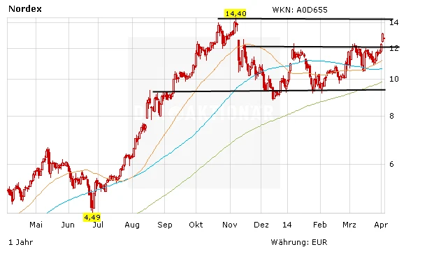 Die Kletterpartie endete bei 13,10 Euro. Zuvor war das Papier nach mehreren vergeblichen Versuchen endlich aus dem lang anhaltenden Seitwärtstrend zwischen 9,00 Euro und 12,20 Euro ausgebrochen. Der Grund für den Höhenflug der Nordex-Aktie: die Windenergie ist der Gewinner des Energiegipfels im Bundeskanzleramt. Beim Treffen von Bundeskanzlerin Angela Merkel (CDU) mit den Ministerpräsidenten der 16 Länder wurde am Dienstag vereinbart, dass der bisherige Entwurf für die Reform der Ökostromförderung in Bezug auf die Förderung der Windenergie nachgebessert wird. "Wir haben jetzt den ersten großen Schritt zur Absicherung der Energiewende geschafft", sagte Bundeswirtschaftminister Sigmar Gabriel (SPD) nach dem Treffen.