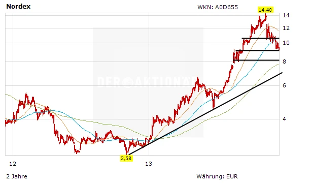 Die Aktie von Nordex sucht weiter nach einem tragfähigen Boden. Auch die wichtige Unterstützung bei 9,50 Euro konnte dem Papier keinen Halt bieten. Am Donnerstag fällt die Aktie bis auf 9,06 Euro zurück. Da kann auch eine positive Einschätzung der Analysten nicht helfen. Die Experten der HSBC haben das Kursziel für die Aktie des Herstellers von Windenergieanlagen von neun auf zehn Euro nach oben gesetzt.