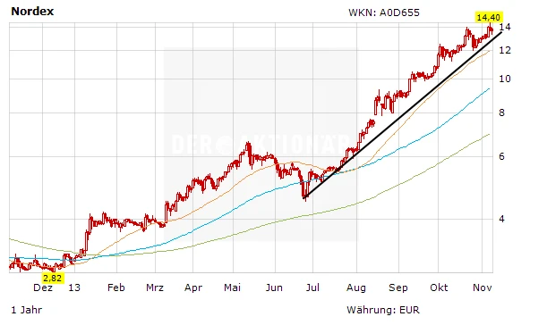 Die Spannung steigt jedenfalls vor den Zahlen für das dritte Quartal. Die wird Nordex am 14. November vorlegen. Sicherlich, viele Analysten gehen erneut von einer Überraschung aus. Dennoch: Das Papier ist in den letzten Wochen sehr gut gelaufen. Stärkere Korrekturen sind nicht ausgeschlossen. Das langfristige Kursziel für das Papier bleibt bei 17,50 Euro. Anleger setzen zur Sicherheit einen Stoppkurs bei 12,80 Euro.