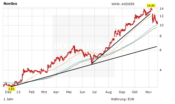 Die Nordex-Aktie kam in den letzten Tagen unerwartet deutlich unter die Räder. In erster Linie hatten die Pläne von Union und SPD die Anleger vergrault. CDU/CSU und SPD wollen die Ökostrom-Förderung in Zukunft einschränken. Auch die guten Zahlen für das dritte Quartal sowie die positiven Aussagen von Vorstand Jürgen Zeschky zum Auftragseingang konnten die Nordex-Aktie nur kurzfristig stützen.