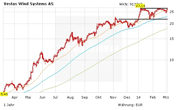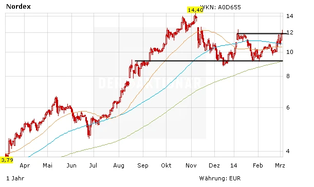 Angetrieben von einem guten Newsflow kletterte die Aktie von Nordex am Donnerstag wieder über die Marke von 12,00 Euro. In einem freundlichen Marktumfeld sollte nun der Weg Richtung 14,40 Euro möglich sein. Hier befindet sich das letzte Hoch aus dem Monat November 2013. Dagegen steht die Aktie von Vestas schon kurz vor dem Break nach oben. Sofern das Papier die Marke von 27,14 Euro knackt, hat die Aktie neues Potenzial. An dieser Marke ist Vestas im laufenden Jahr bereits zwei Mal gescheitert.