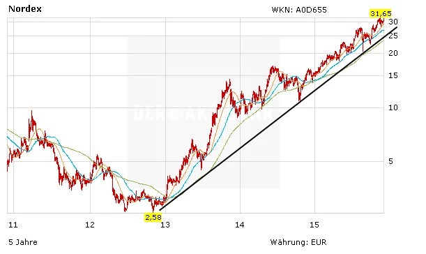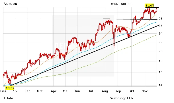 Hersteller von Windkraftanlagen wie Nordex dürften die Gewinnerwartungen des Marktes nach Einschätzung der US-Investmentbank Goldman Sachs deutlich übertreffen. Analyst Manuel Losa habe seine Schätzungen für das Ergebnis vor Zinsen und Steuern (Ebit) des TecDax-Unternehmens angehoben, da sich Auftragslage, Umsatz und Gewinnmargen in der Branche besser entwickelten als erwartet, schrieb der Experte in seiner aktuellen Studie. Seine Ebit-Schätzungen für 2015 bis 2017 lägen durchschnittlich rund ein Viertel über denen des Marktes. Losa schraubte sein Kursziel von 35 auf 38 Euro nach oben. Damit sieht er ein Kurspotenzial von rund 23 Prozent und bestätigte sein Kaufvotum.