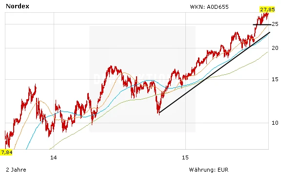 Das starke Wachstum von Nordex erfolgt derzeit im Einklang mit steigenden Margen. Das Geschäft läuft klasse, die Aktie bleibt aussichtsreich. In einem freundlichen Marktumfeld lautet das nächste Etappenziel 30 Euro. Fällt diese Marke, rückt das Hoch von 32,73 Euro aus dem Jahr 2008 in den Fokus.