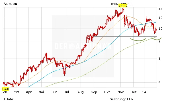 Gabriels Pläne haben zuletzt auch die Aktionäre von Nordex verschreckt. Das Papier sackte in den letzten Wochen von knapp 11,60 Euro auf 9,20 Euro ab. Hier setzte am Mittwoch wieder verstärkt Kaufinteresse ein, die die Aktie bis in die Region 9,60 bis 9,90 Euro führte. Wichtig war dabei, dass die horizontale Unterstützung bei 9,00 Euro gehalten hat.