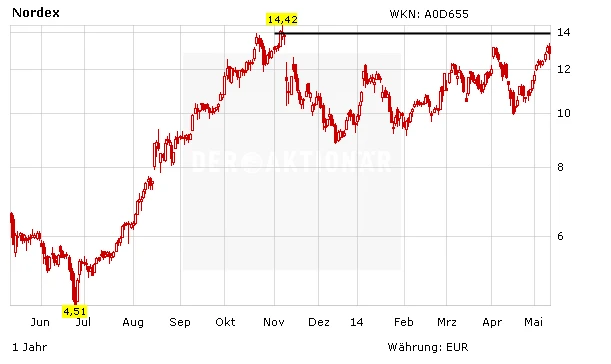 Für das laufende Geschäftsjahr ist der Vorstand extrem zuversichtlich. Daher erhöhte Nordex die Prognose für 2014. So erwartet der Vorstand jetzt ein Umsatzvolumen von 1,5 bis 1,6 Milliarden Euro (zuvor: 1,4 - 1,5 Milliarden Euro). Die EBIT-Marge soll 4,0 bis 5,0 Prozent erreichen (zuvor: 3,5 - 4,5 Prozent).