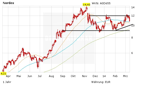 Erwischt hat es auch Nordex. Das Papier ist bis 10,50 Euro abgerutscht. Geht die Unsicherheit in der Ukraine weiter, ist es durchaus möglich, dass viele Anleger ihre Papiere auf den Markt werfen und die Aktie bis auf die untere Begrenzung des Seitwärtstrends bei knapp 9,00 Euro zurückfällt. Spätestens dann sollte das Papier Halt finden.