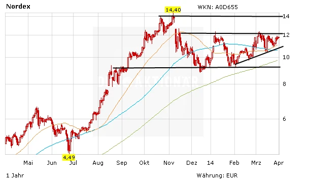 Die Konkurrenz macht es vor. Die Aktie des danischen Windanlagenherstellers Vestas ist auf ein Drei-Jahres-Hoch geklettert. Nordex hinkt noch etwas hinterher. Noch immer hängt die Aktie in der Seitwärtsrange zwischen 9,00 Euro und 12,20 Euro fest. Dennoch hat sich in den letzten Wochen ein kurzfristiger Aufwärtstrend ausgebildet. Ein freundlicher Gesamtmarkt vorausgesetzt, könnte das Papier in den nächsten Tagen endlich den Sprung über die horizontale Widerstandslinie schaffen. Die Voraussetzungen dafür sind gut, fundamental ist bei Nordex alles im Lot. Der Umsatz soll im laufenden Jahr auf 1,5 Milliarden Euro klettern. Die Marge wird zwischen 3,5 und 4,5 Prozent erwartet.