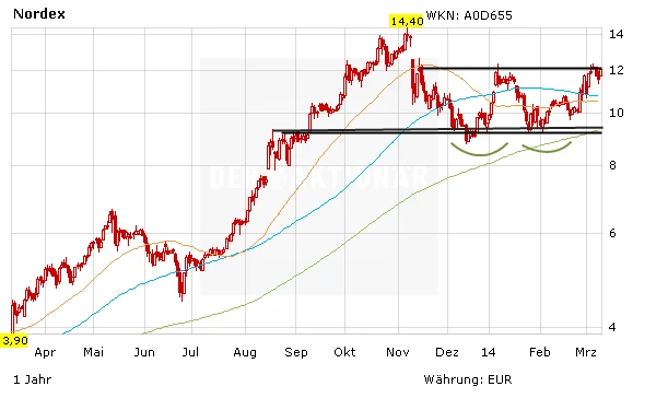 In einem eher schwachen Marktumfeld, das nach wie vor durch die Krim-Krise geprägt ist, zeigt sich die Aktie von Nordex von ihrer besten Seite. Das Papier ist drauf und dran, die Marke von 12,00 Euro zurück zu erobern. Hier verläuft die obere Begrenzung des Seitwärtstrends.