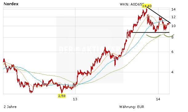 Jetzt gilt es den Schwung mitzunehmen. Die Aktie von Nordex hat in den letzten Wochen wieder Boden gut gemacht. Von 9,20 Euro kämpfte sich das Papier zurück bis knapp an die Marke von 11,00 Euro. Am Montag sorgte ein neuer Auftrag des niederländischen Energieversorgers Eneco für einige Prozentpunkte Kursgewinn bei der Nordex-Aktie.
