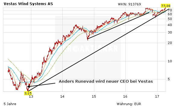 DER AKTIONÄR hätte sich eher einen neuen CEO von außerhalb des Unternehmens gewünscht. Wie zum Beispiel bei Vestas. Bei dem dänischen Windanlagenbauer hat nach mehreren Verlustjahren im September 2013 Anders Runevad das Ruder übernommen. Er war vorher beim Telekommunikationsdienstleister Ericsson.