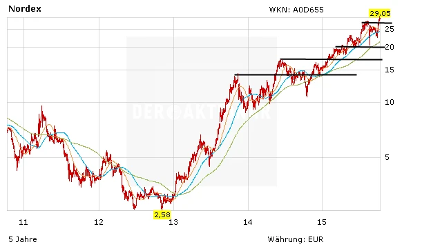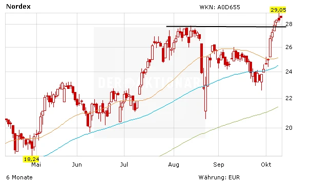 Die Nordex-Aktie besticht nach wie vor durch Relative Stärke. Der Gesamtmarkt hat seine Fesseln abgelegt und endlich die Marke von 10.000 Punkten zurückerobert. Dabei glänzte erneut die Aktie von Nordex. Das Papier notiert auf einen Mehrjahreshoch, die wichtige Marke von 30 Euro ist nicht mehr weit entfernt. Wird die psychologisch wichtige Marke nach oben geknackt, lautet das nächste Ziel 32,67 Euro. Auf diesem Niveau notierte die Nordex-Aktie zuletzt im Jahr 2008!