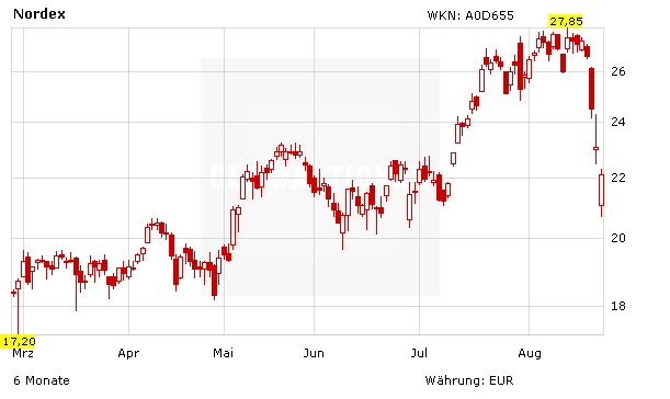 Zum Kurstreiber könnte der Mitte Oktober geplante Kapitalmarkttag des TecDAX-Unternehmens werden, schrieb der Analyst. Auf der Veranstaltung dürfte Nordex einen positiven mittelfristigen Ausblick geben. Die Erwartungen des Marktes könnten im Anschluss steigen. Losa rechnet zudem damit, dass Nordex die Anleger ab 2016 durch die Ausschüttung einer Dividende am Unternehmenserfolg beteiligen wird. 2017 könnte diese dann sogar verdoppelt werden. Die Einstufung von Goldman Sachs lautet deswegen klar „Buy“.