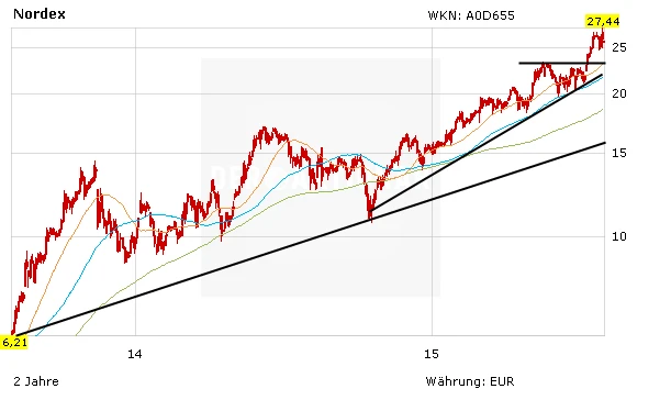 Neben Goldman Sachs hat auch Analyst Holger Fechner von der NordLB sein Kursziel für die Nordex-Aktie erhöht. Er sieht das Papier bei 30 Euro fair bewertet. Vorher lautet das Kursziel 24 Euro. Die schon dynamische Geschäftsentwicklung bei Nordex habe sich im zweiten Quartal 2015 sogar noch erhöht, begründet der Experte seine Einschätzung.