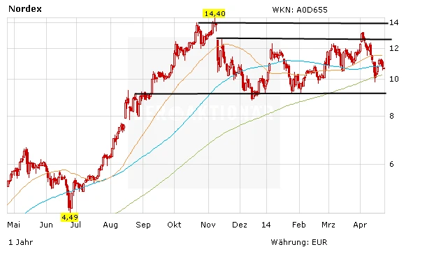 Nachdem sich die 200-Tage-Linie als Unterstützung erwiesen hat, kämpft die Aktie von Nordex derzeit mit der 90-Tage-Linie. Wird diese geknackt, hat die Aktie bis 12,20 Euro Luft. Dann wartet der nächste hartnäckige Widerstand. Knapp darunter, nämlich bei 12 Euro liegt das Kursziel von Analyst Sven Diermeier. Der Experte in Diensten von Independent Research die Nordex-Aktie am Donnerstag von "Verkaufen" auf "Halten" hochgestuft. Der Windanlagenhersteller finde sich auf einem guten Weg die Ziele im Jahr 2015 zu erreichen, so Experte.