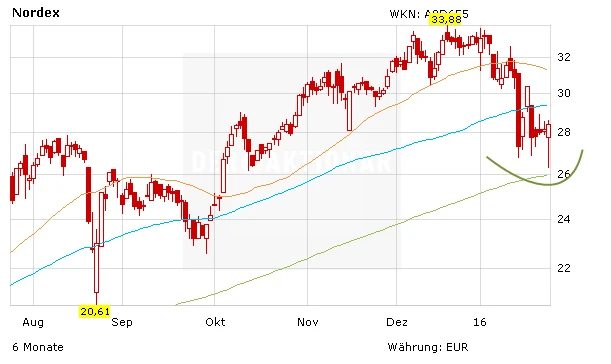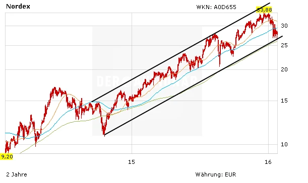 Nun ist es doch passiert. Am Dienstagvormittag wurde die Nordex-Aktie abverkauft. Bis auf 26,20 Euro ging es nach unten. Hier traf die Aktie dann auf die 200-Tage-Linie. Das Papier drehte im Anschluss wieder auf und machte den anfänglichen Tagesverlust wieder wett. Geholfen hat dabei sicherlich auch die Meldung, dass Nordex einen neuen Deal in Finnland an Land gezogen hat. Mit der finnischen Vermögensverwaltung Taaleritehdas wird Nordex 2016 und 2017 für sechs Projekte insgesamt 72 Turbinen vom Typ N131/3000 liefern.Kaufkurse