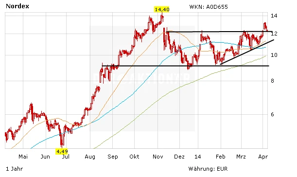 Fundamental ist bei Nordex alles in bester Ordnung. Vorstand Jürgen Zeschky hat zuletzt die Prognose für das Gesamtjahr bestätigt. Die Nachbesserung des EEG sollte der Aktie weiterhin Rückenwind verleihen. Dennoch: Wichtig wäre jetzt, dass die Aktie von Nordex nicht wieder nachhaltig unter die Marke von 12,20 Euro abtaucht.