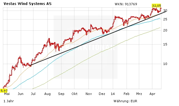 Eine wichtige Unterstützung stellte zuletzt die ansteigende 200-Tage-Linie dar. Knapp über der Marke von 10 Euro drehte das Papier von Nordex wieder nach oben. Im Zuge der freundlichen Marktentwicklung hat das Papier des Herstellers von Windenergieanlagen wieder Boden gut gemacht. Eine Steilvorlage für weiter steigende Kurse liefert Branchenkonkurrent Vestas. Die Aktie liegt nach wie vor in einem lupenreinen Aufwärtstrend und konnte ein neues Drei-Jahres-Hoch markieren.