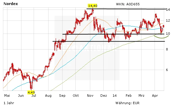 Unterstützung bekam das Papier von Nordex zuletzt von Warburg Research. Analyst Christopher Rodler rät zum Kauf der Aktie. Nach Gesprächen mit dem Hamburger Unternehmen erwartet Rodler einen starken Auftragseingang im ersten und zweiten Quartal.